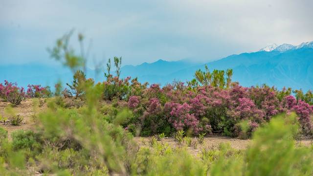 夏季的是红柳花开得最灿烂的季节,这种玫红的小花开得满树都是,和周围嫩绿的各种灌木以及远方的青黛色的雪山形成鲜明对比。据说甘家湖这里红柳树产出的柳花茶,清朝时是给朝廷的贡品。