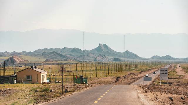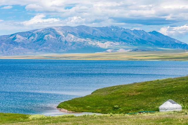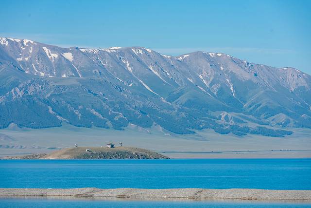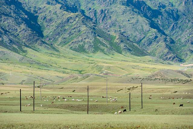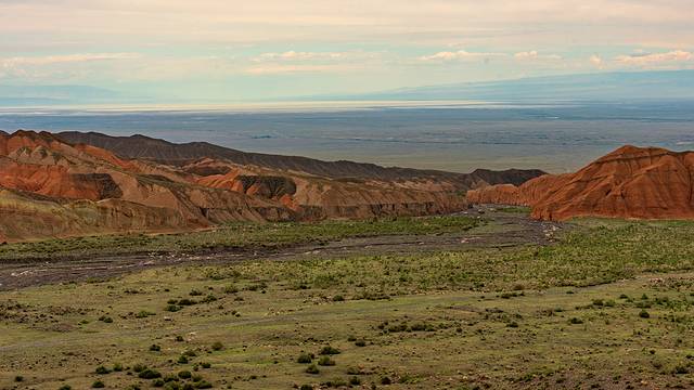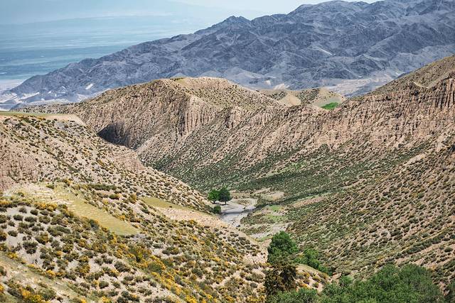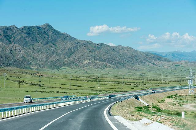 两侧阿拉套山、别珍套山逶迤连绵,遥遥相望