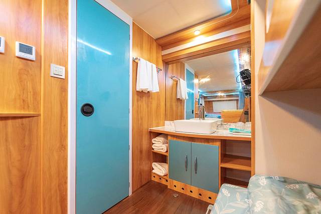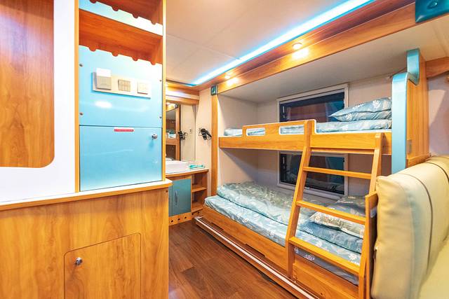 房车的两头各有再张单人床,可以同时供四人住宿。其中车头的两个床位可以躺着透过大天窗晨沐阳光、夜观星斗。