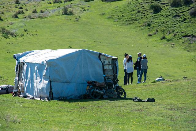 我们走了过去,和男主人聊了起来,原来他们刚转场到这个海拔较高的地方,这里的草原经过一个冬季休养,如今正是最茂盛的时候,羊群在这里可以直接躺在草丛中不用四处走,便可以吃到鲜嫩的青草,正是快速长膘的时候。