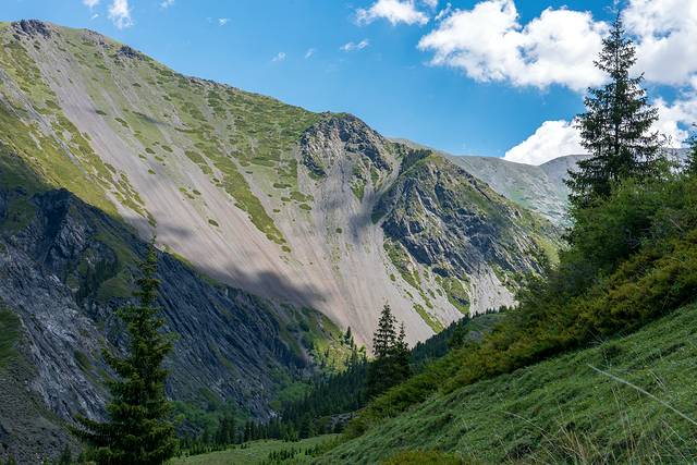 黄色的花岗岩石从绿色的高山草甸中渐渐显现。