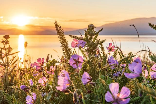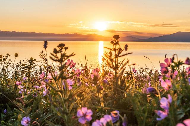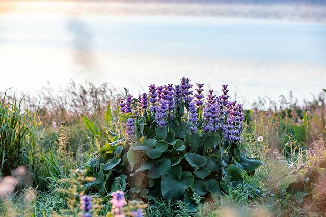 当红日升起,面前的的湖岸也被照亮,湖畔的野花像是突然被涂上了色彩,原本黑压压的一片空地,瞬间鲜活了起来。