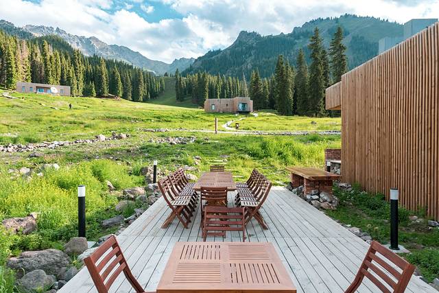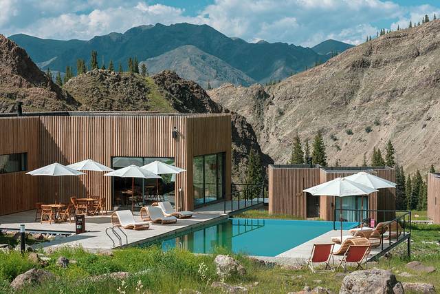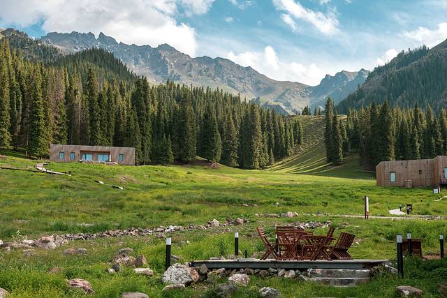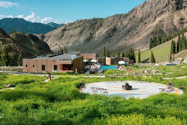 开了几个小时颠颠簸簸的土路,忍受手机没有信号的折磨,来到了这座西天山深处克鲁格野奢酒店,我有种遇见桃花源的感觉。