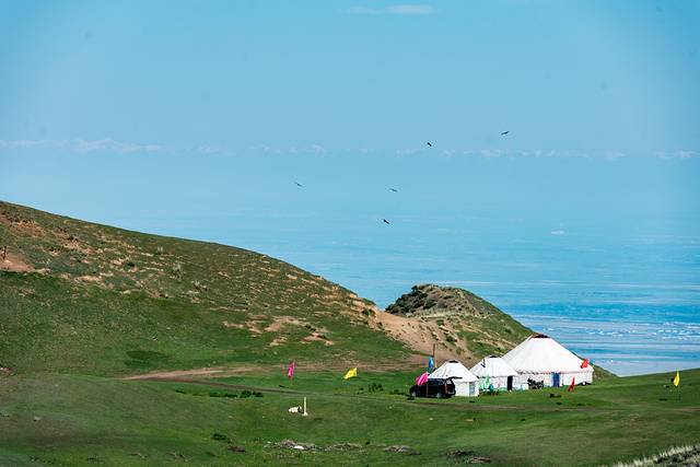 山坡下,还有几幢白色的毡房,原来这里住着一户哈萨克族人家,这是是他们的夏牧场。