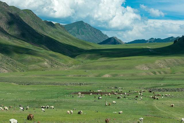 羊群和白云,仿佛草原美丽的双生子。夏季的牧场,白云在蓝天上流动,羊群在绿草上游走,天地间,呼应暗合。