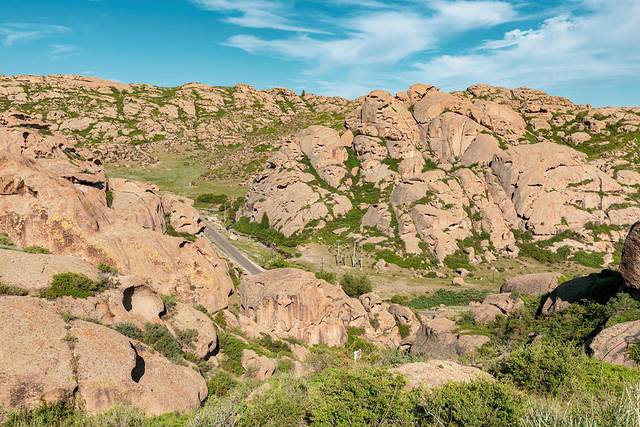怪石峪是个在中哈边境钱上的风景区。一条笔直的公路一直来到怪石峪,公路两旁是高大的山峦,青青草原随处是羊群。