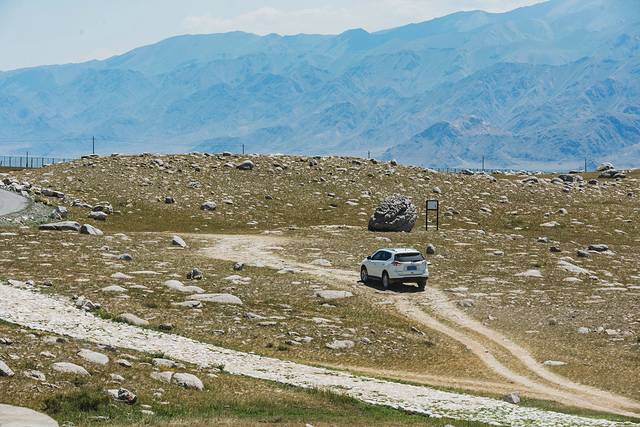 汽车驶进阿敦乔鲁景区,布满砂砾的半干旱草场尘飞扬、秋草黄。白云慵懒地披裹在半山腰,远处青黑色山尖儿上覆盖着皑皑积雪,像黑蛋糕上抹涂了一层厚厚的奶油。