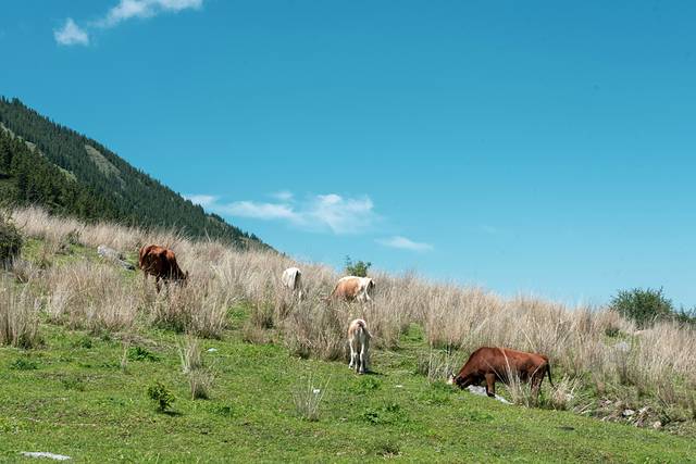 继续向上,出现在我们面前的是牛群,眼前的风景让人误以为在阿尔卑斯山脉里,实际上,天山山脉也深藏着这样的美景。