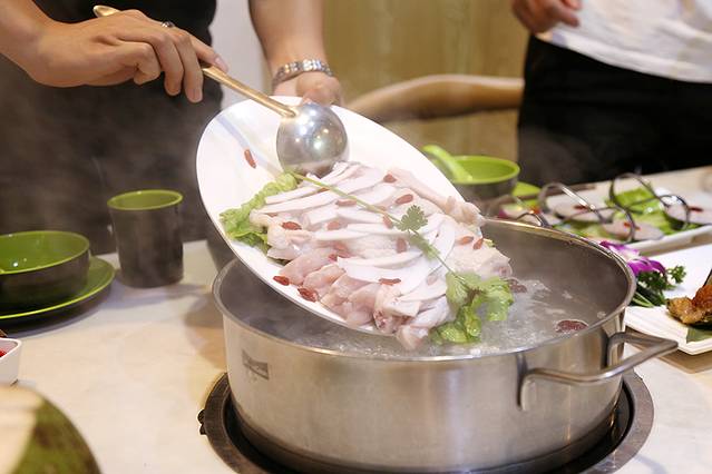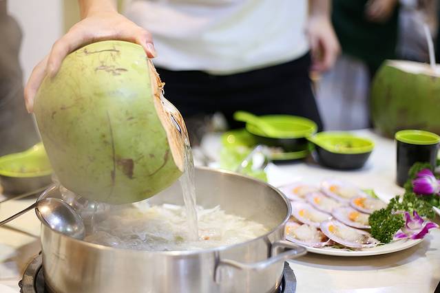 锅底一颗椰子的椰汁打底,上桌之后再加两颗椰子、当面加进锅底中,这就是:三颗椰子一锅汤