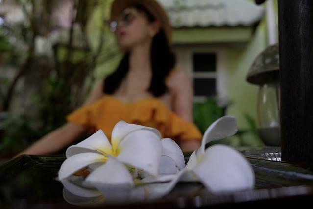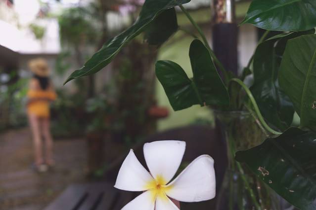 我们拖着行李走进去的时候,音乐声如潺潺流水,一朵鸡蛋花从树上轻轻掉在我的脚边。