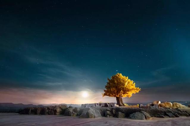 一棵金灿灿的许愿树在桥头闪闪发光,