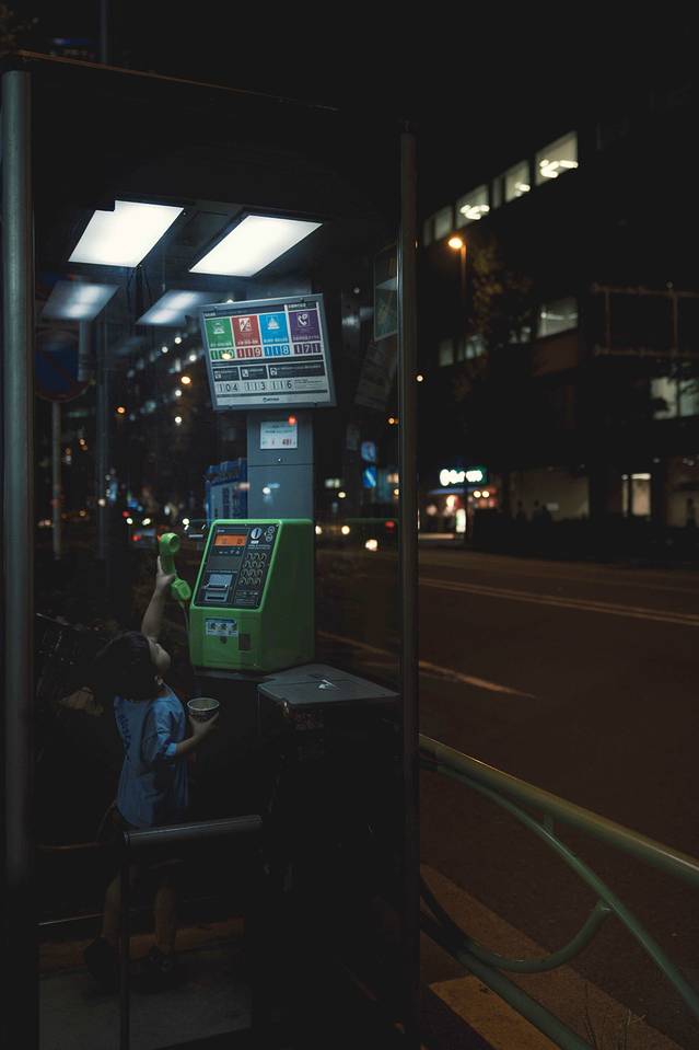 ▼ 东京的街头,依然有很多这样的复古电话亭。 泰山主动进去,说要给奶奶打个电话:“嘟嘟嘟嘟。”挂掉。