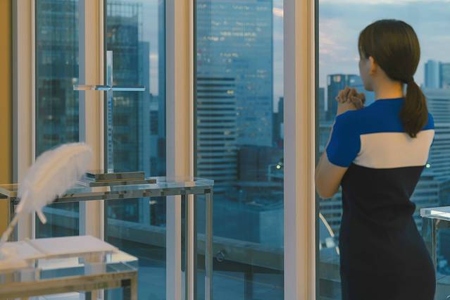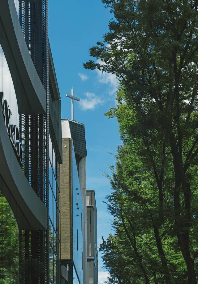 教堂建筑是给人们的肉体和心灵提供休憩的空间,从天空教堂里望出去,会看见远处绵延的青山,还有近旁林立的高楼,教堂藏匿于繁华都市之中,却独善其身,让人沉寂。