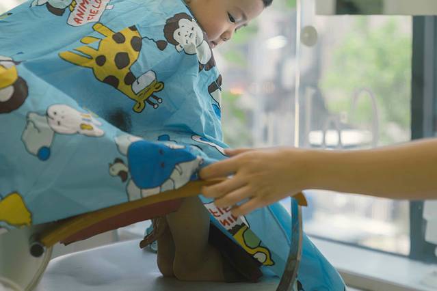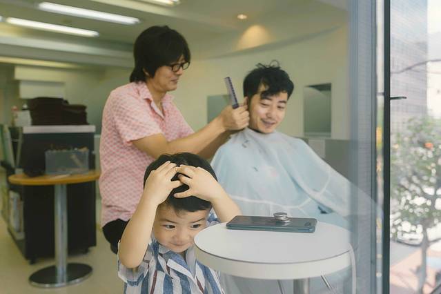 和老板艰难的沟通造型,他实在理解不了,就用一本杂志,很耐心的翻给我们看,最终选定一款,开剪。我还记得,我不停的告诉发型师:“we gonna get a hair cut together just alike.”看他一脸迷茫,我又补充“he,me,same,same.dad and son,same hair.”我们会心相视一笑,看来关键时刻,还得单词交流最有效。