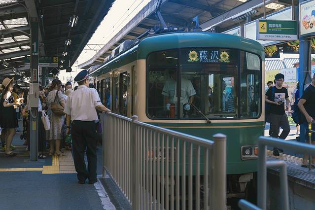 ▼曲折坎坷的,我们终于来到了镰仓,乘坐具有镰仓特色的江之电。江之电全称“江之岛电铁线”,全程10公里,往返于镰仓站和藤泽站之间,停靠站包括热门的灌篮高手中的镰仓高校前站,江之岛站,极乐寺站等。