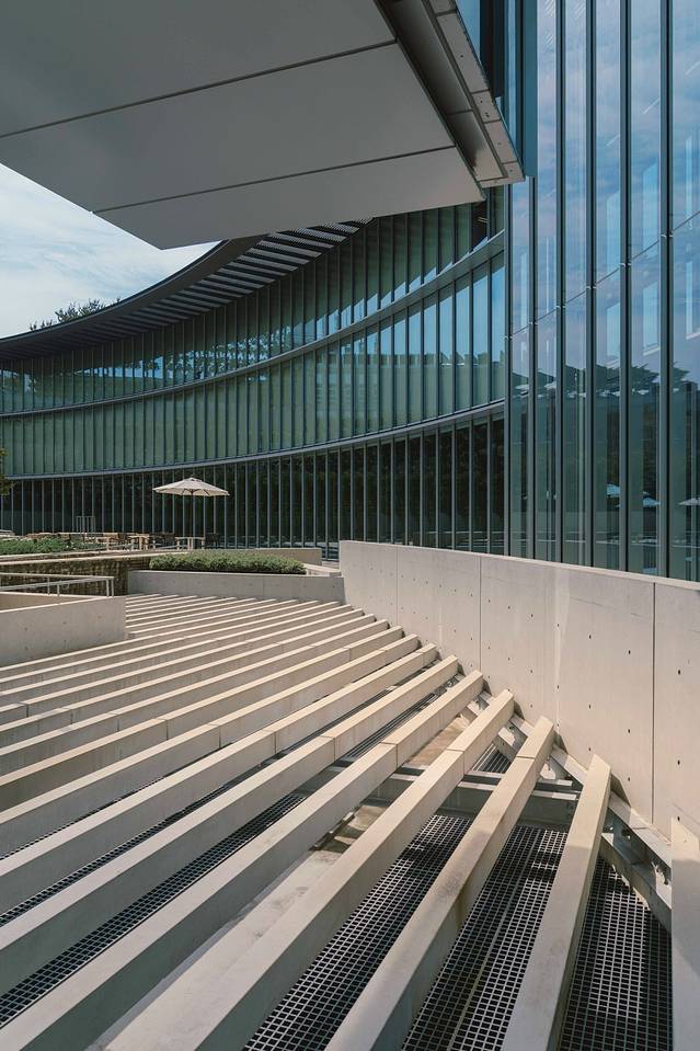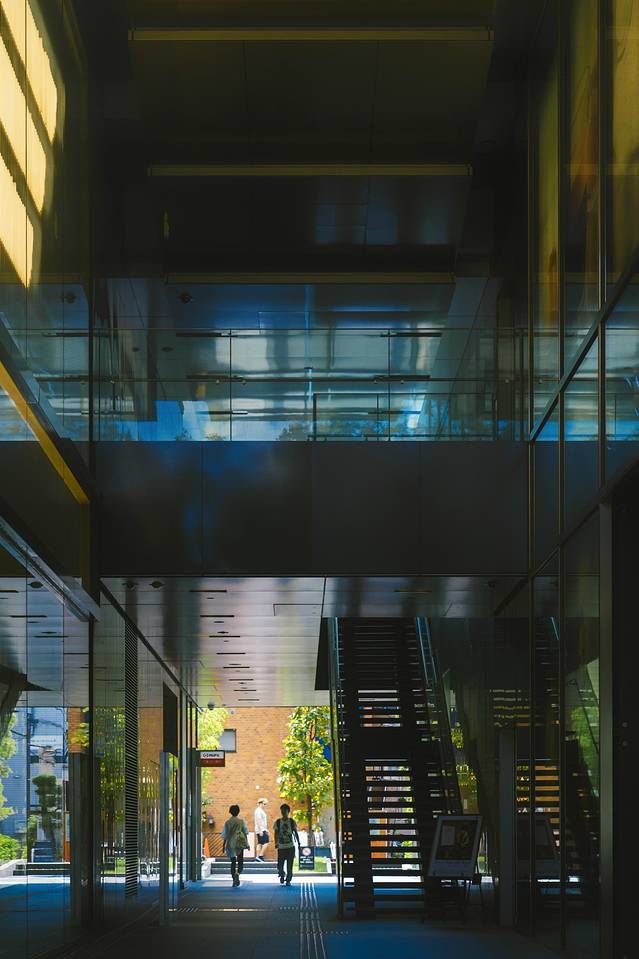 表参道是一条约1.1公里的斜坡路,这条路见证着日本的历史。安藤忠雄让新建建筑高度和道路两旁的榉树保持一致,玻璃幕墙内部则是一个中庭,从地下三层到地上三层的坡道和表参道的坡度相同,形成一种内外呼应。