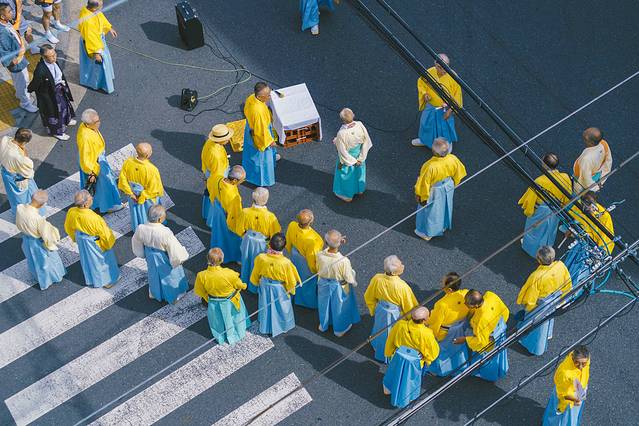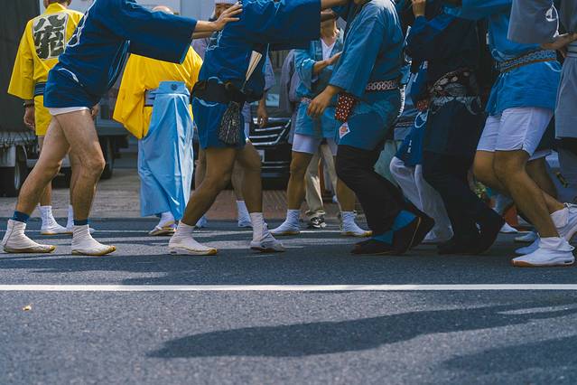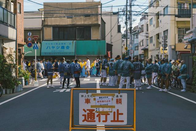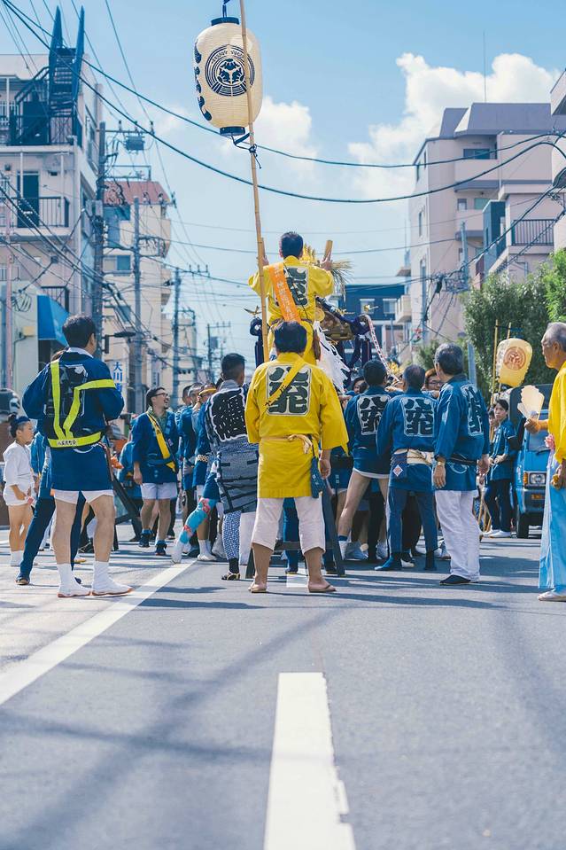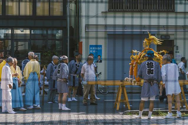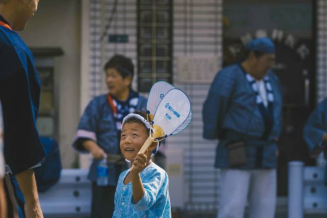 时不我待,我拿着相机快步下楼,第一次看到神社祭祀,不免激动。街道上,无论老人,年轻人,孩子都穿上了传统服饰,不同的颜色是区分不同的神社。