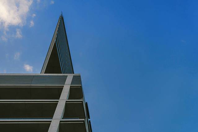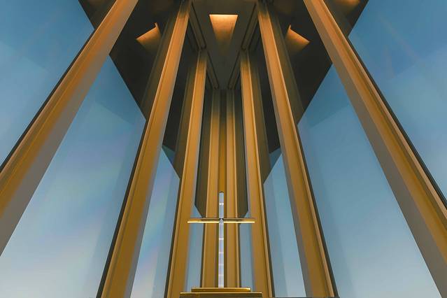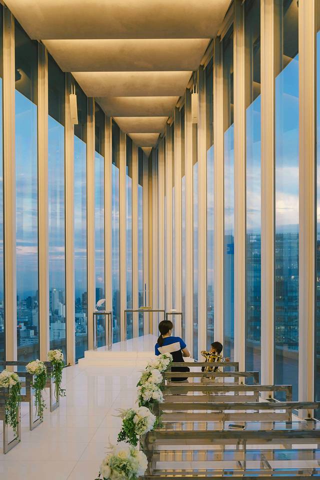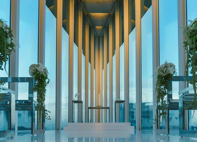 ▼天空空中教堂位于酒店的十六楼,静静的伫立在高楼之上,感受着四季的扭转和光线的游移。它利用V字形的顶层落地窗,将人们的视线最终集中到V字的最尖端——那个神圣的十字架。推开大门,我们就好像被水晶包裹了一样,一个楔形的端点就是教堂的水晶十字架。耳边一直环绕着圣洁的歌曲,不由自主的合十祷告。黄昏前往,虽没有白天透亮,但正值夕阳西下,大面积的蓝和太阳的橙色光晕交织在一起,和教堂内部的灯光一同呼吸。