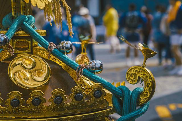▼这个金色的手工艺品就是“神轿”了,这些神轿重量一般重达500公斤,800、1000公斤的都有,难怪需要这么多人一起抗起来。