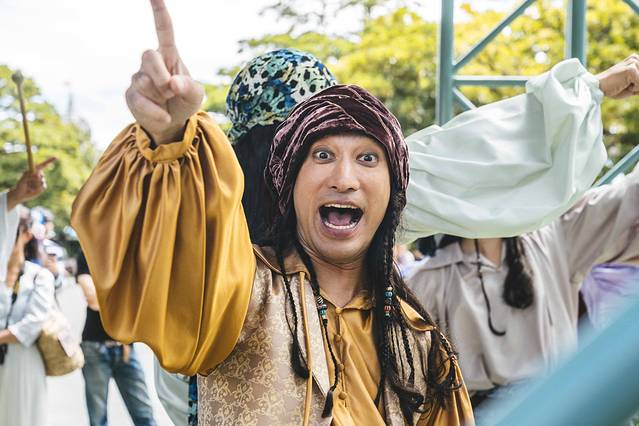 在酒店,一大早就被屋外的吆喝声、哨子声唤醒,还以为发生了集体斗殴事件。探出头一看,一群穿着花花绿绿衣服的人正在街头,抬着金色的物品缓步向前。
