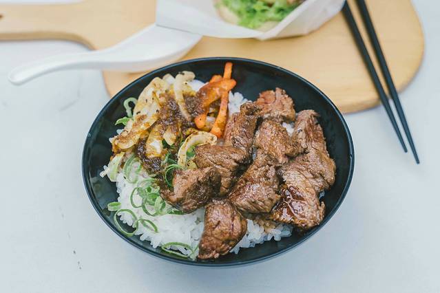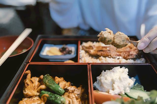 我们在小店二楼进餐,又甜又咸的调味酱口感不错,套餐的配食很丰富,有肉串,味增汤,分量足够。享用的过程中,周围出现了很多上班族结伴来进午餐的,他们说话小声,就像害怕惊醒了沉睡的婴儿,我们也不敢多言,埋头一阵沉默,迅速干掉了饭。