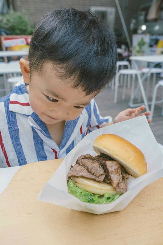 ▼台风后的第一餐,尤其的香,泰山对着一个牛肉汉堡呵呵傻笑,看来他也对机场的面包和方便面产生了阴影。日本随处一个街边小店,就能把牛肉做到很嫩滑,适合小朋友的口感。