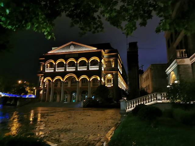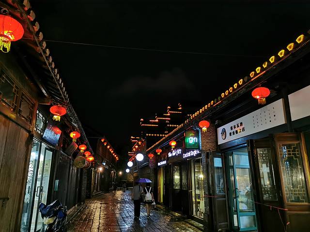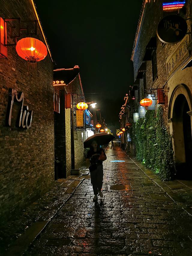 晚上刚好下过雨,灯影重重,雨也朦胧。
