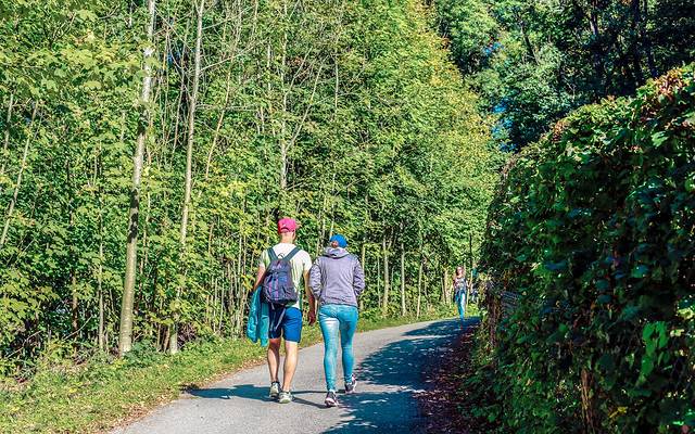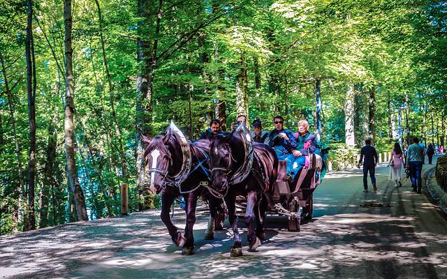 来的时候错过了马车,一路步行上去,树木葱绿,时疏时密,倒也清幽雅致,俨然走入了一处天然氧吧;水泥路的两旁用石头垒起路基,路面宽敞,时不时的还会碰到上山或下山的旅客,互相问着好示意~