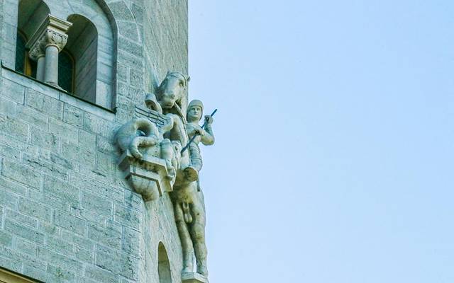 玛丽安广场有好几处适合登高俯瞰慕尼黑,我们选择了新市政厅;这座占据了整个玛利亚广场北侧的新哥特风格建筑建于19世纪末,整体由浅棕色石材建造,外墙上装饰有很多灰色石雕~