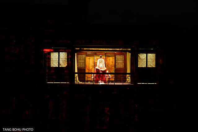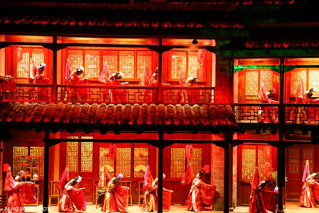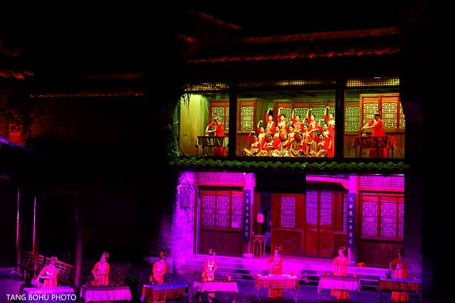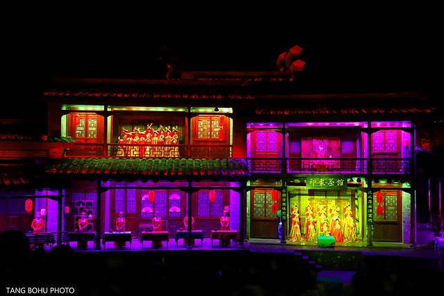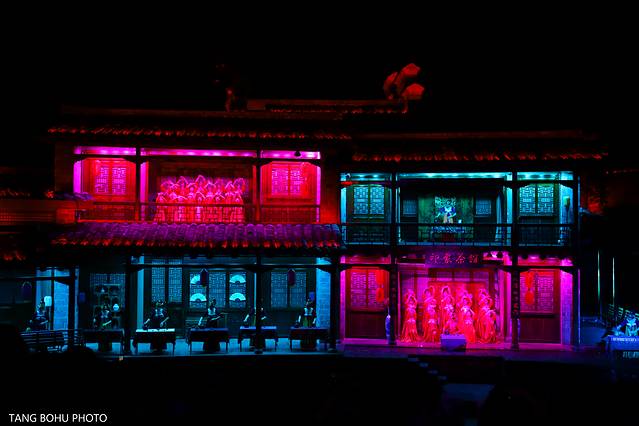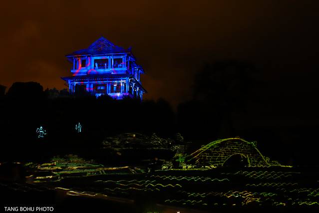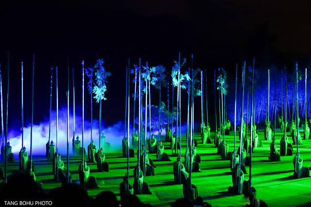 利用灯光技术,3D的灯光技术把一片山变成了有水有山,有房子,有人的景色,在晚上观看还是比较有感受的,灯光会随着舞台的转动而变化。360度旋转舞台,每旋转一次就可以看到不同的场景。灯光效果强,给人置身在山林的感觉。