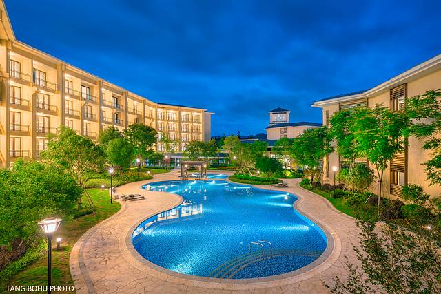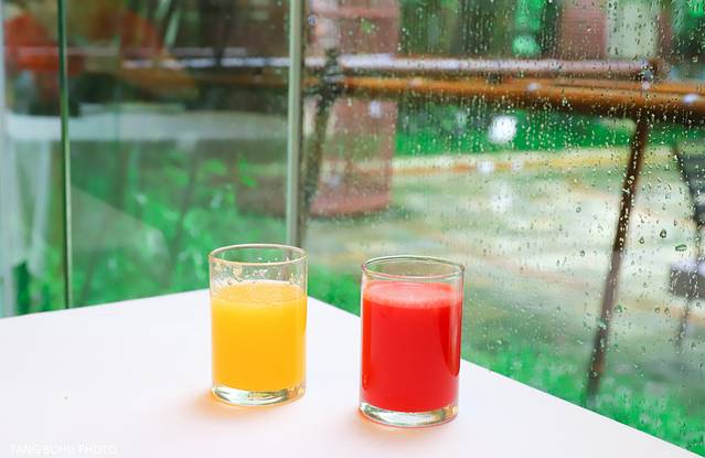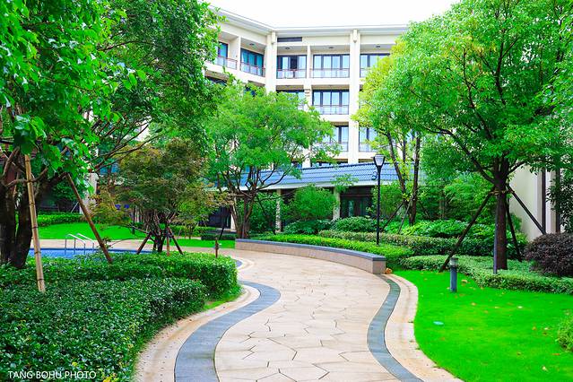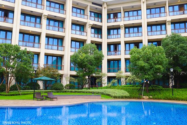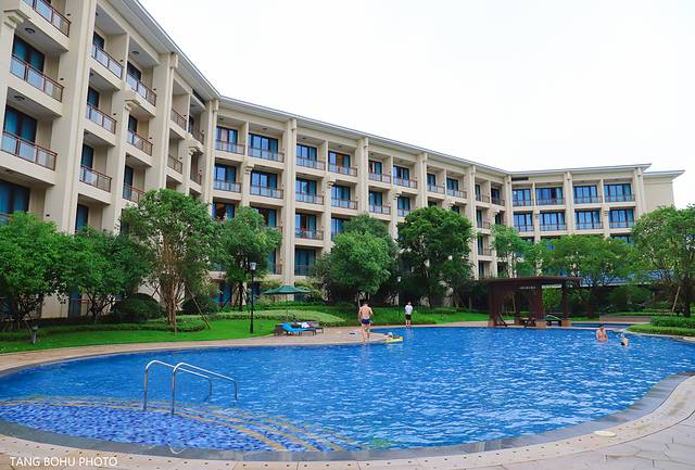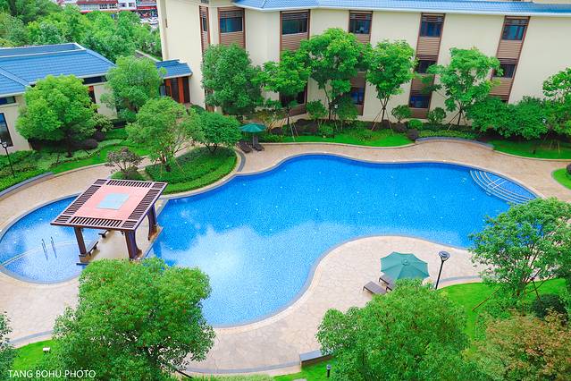 雨一会下一会停,一停雨就有很多入住在这里的房客在游泳池里游泳,整个酒店有两个游泳池,一个室外一个室内,室外的游泳池周边绿树成荫,蔚蓝的游泳池,我想要是在天气好的时候,这里游泳池成了最受欢迎的地方。
