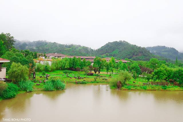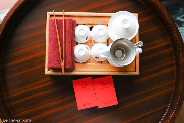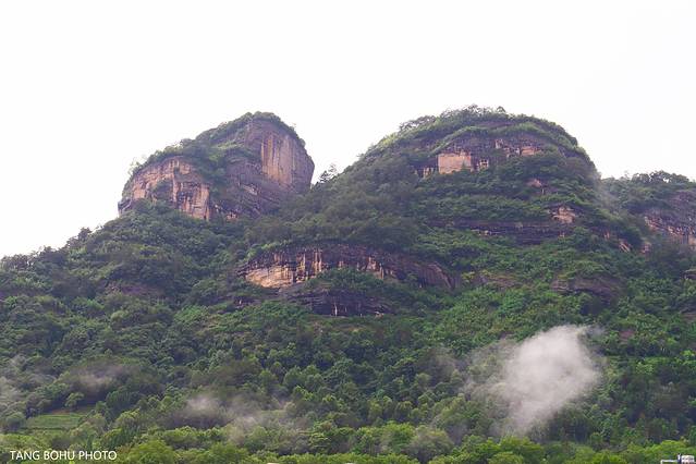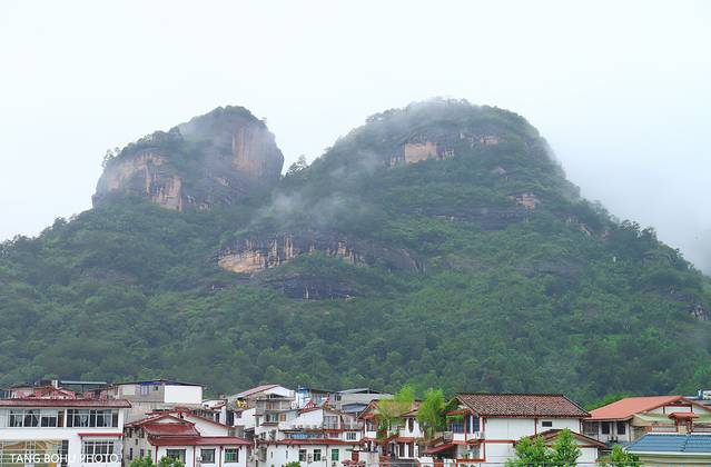 酒店房间里提供了餐具还有两包大红袍,外面又下起了大雨,适合在房间里泡泡茶喝,和夫人共饮大红袍茶,一边欣赏着窗外大王峰景色,一边喝着茶看着书,享受着这烟雨的另一种乐趣。原本计划去爬天游峰,坐竹筏的,这下可好了,啥也去不了了,雨下了一会又下起来了,只能到周边逛逛,于是打着雨伞到处逛下。眼前的大王峰依旧是烟雾缭绕,如梦幻般一样。
