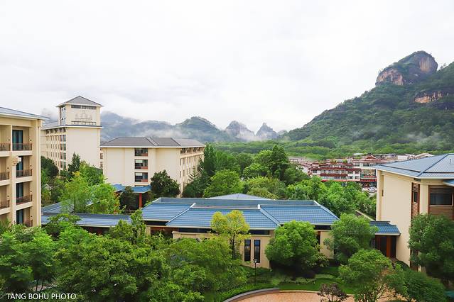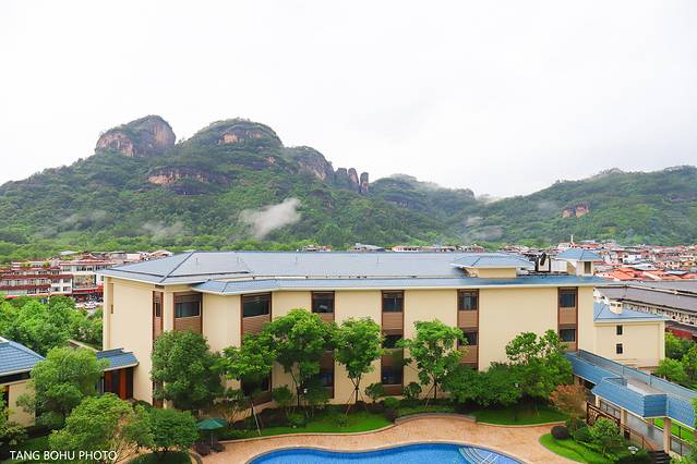 在往另一侧望去,群山烟雾缭绕,犹如仙境般,烟雾随着风缓缓移动着,轻飘飘的。下雨的时候,武夷山变成了一幅幅山水水墨画,景色优美,在房间的阳台上足不出户就能看到武夷山大王峰景色。大王峰倒影在蔚蓝的游泳池里忽隐忽现。