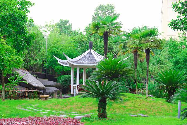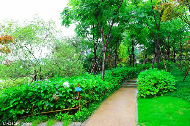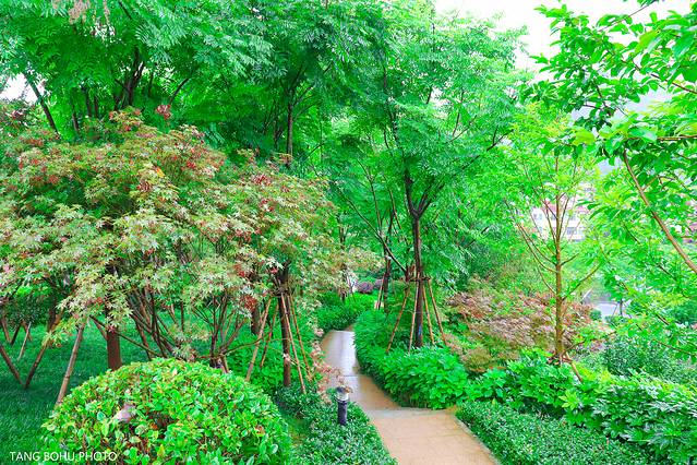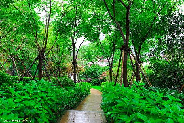 雨水打湿了路,郁郁葱葱的树,在上坡的地方种了各种树,每一个季节 颜色都不一样,也许秋天来的时候这里就变成了红色的了,夏天的绿色让我喜欢上这种清新的色彩,在这里多了一份绿意。