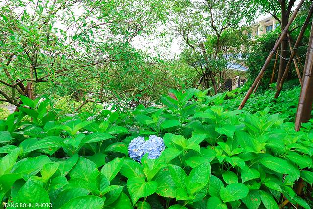 在二期入口的地方,雨滴还挂在绣球花瓣上,绿色的叶子,到处都是绿色。在武夷山周边随处可见到绿色植物,紫色的绣球花开得正艳丽。