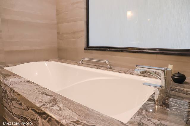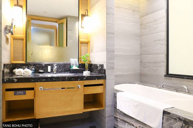 洗浴间一个超大的白色浴缸更是吸引人,黑白相间的大理石台面,有山水纹路的墙壁砖更能体现把武夷山水融入其中。在浴缸旁还放着香薰,在一边享受泡澡的同时,又能闻到香薰的清香味道,让旅行更加舒适与愉快,轻松又自在。