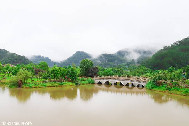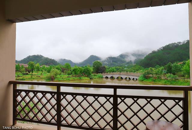 在武夷山大红袍山庄走出阳台又是另一种酒店,连续的暴雨已把湖里的水灌得满满的,远处的山峰连绵起伏,烟雾缭绕,若隐若现有梦幻般的感觉。远处的山,小桥,风车,有山有水这样的景色让人流连忘返。