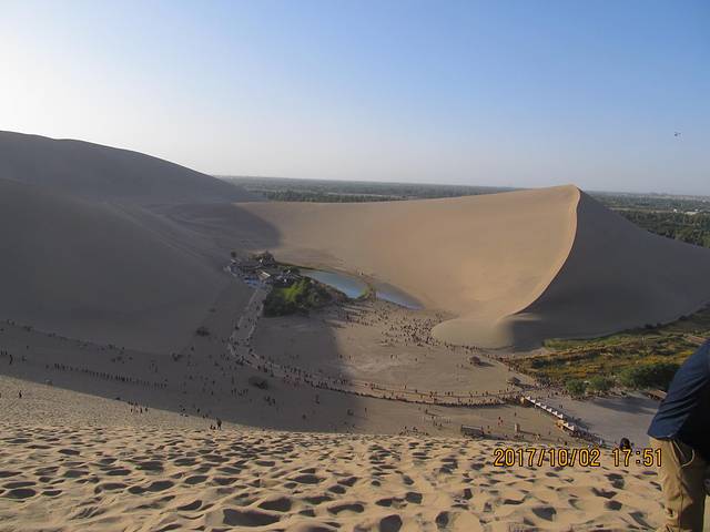 由于朋友从新疆出发,我从成都出发,所以我们将汇合地点选在了敦煌,也是此次行程的第一站。9月30日晚我从成都出发,乘坐火车经成都——宝鸡——敦煌,车程33个小时左右。到达敦煌已是10月2日早晨9点钟,和朋友汇合后再到宾馆放置好行李已经是中午12点了。下午半天的时间我们就去了鸣沙山和月牙泉,其实月牙泉就在鸣沙山里面。