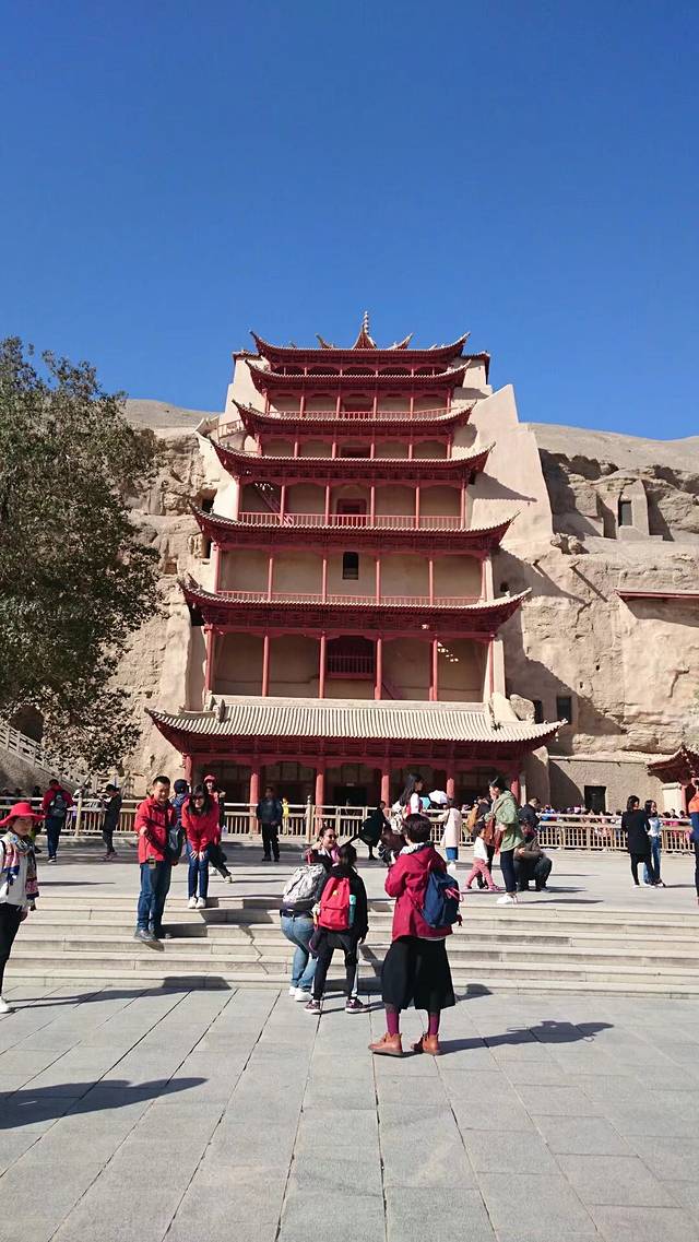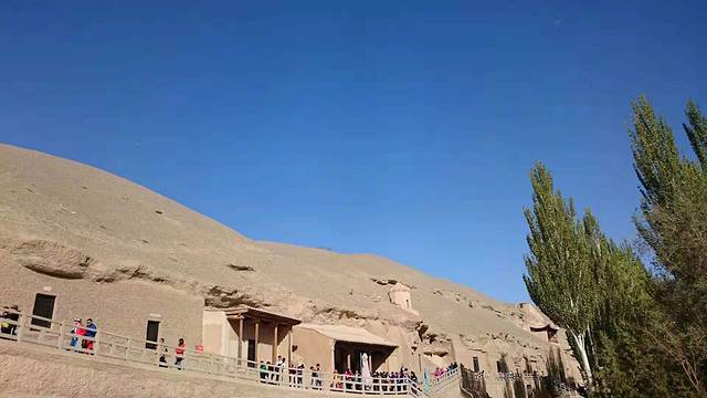 第二天早晨和朋友一大早起来,就赶去莫高窟(门票100元/人)。只能说节假日人就是多,摆渡车要排队,进入莫高窟内也要排队,只有莫高窟的大门没排队。不过在进入莫高窟内排队时,旁边有小学生轮流(每次2人)给你讲解莫高窟的历史,还是很不错的,看着这些小小的志愿者感觉很暖心。由于莫高窟内不能拍照,就只有边看边听讲解,由于人太多,好多东西都没法停下来细看。并且由于年代久远,很多东西都变得模糊不清,不过出去之后有个博物馆,里面有很详细的介绍,如果要细听细看,这最好准备一天的时间。