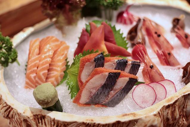 【刺身拼盘】里的每一样鱼生,新鲜程度自然是不用说,厚切三文鱼、北极贝、甜虾、海螺,选的都是大家接受非常高的海鲜刺身,蘸上芥末酱油,刺激着你的味蕾。
