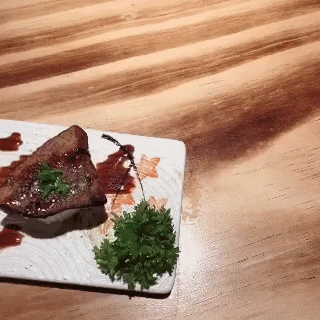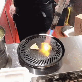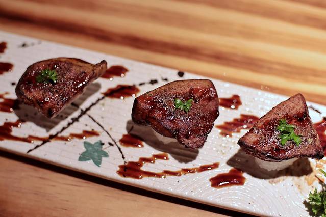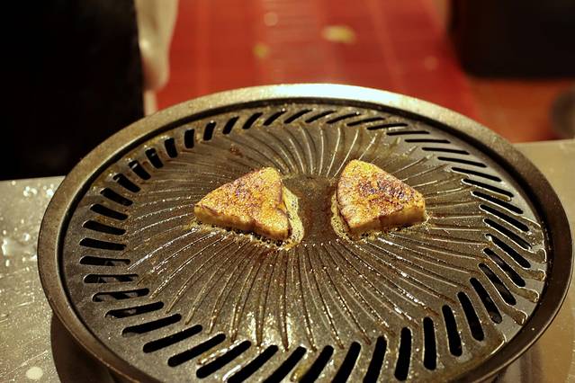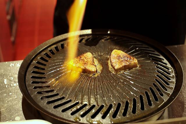 看到厨师拿出一大块鹅肝时,眼睛已经发光了。鹅肝放置铁盘上用烈火炙烤,瞬间里面的脂肪流出金黄色的油,一股香气也随之扑鼻而来,这时不禁咽了咽口水。