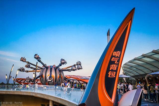 在“喷气背包飞行器”中,游客们将变身太空飞行员,搭乘未来的交通工具起飞。飞行员将被固定在独立的喷气背包上,双腿悬垂,尽享飞行的快感与奇妙体验。随着每个喷气背包的加速旋转,其臂杆会升至空中。游客可以自行控制喷气背包的上升高度,升得越高,前倾幅度就越大。在高空瞭望点,飞行员们将欣赏到“明日世界”以及上海迪士尼乐园令人摒息的壮丽美景。