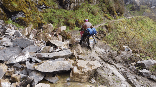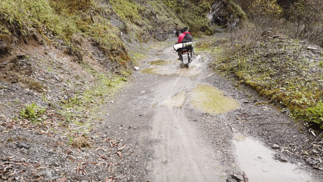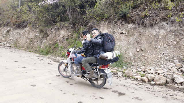 刚才说到的面包车,真的带我们只走了有八分之一的路程,在途中老板多次提醒我,别玩手机了,小心晕车。我嘛,不是不听,是因为我天生黄土高原, 盘山 公路对我没有威胁。到了指定了换乘点,真的是换乘,由四个轮子的面包车,换乘了四个轮子的摩托车,当然是两台。