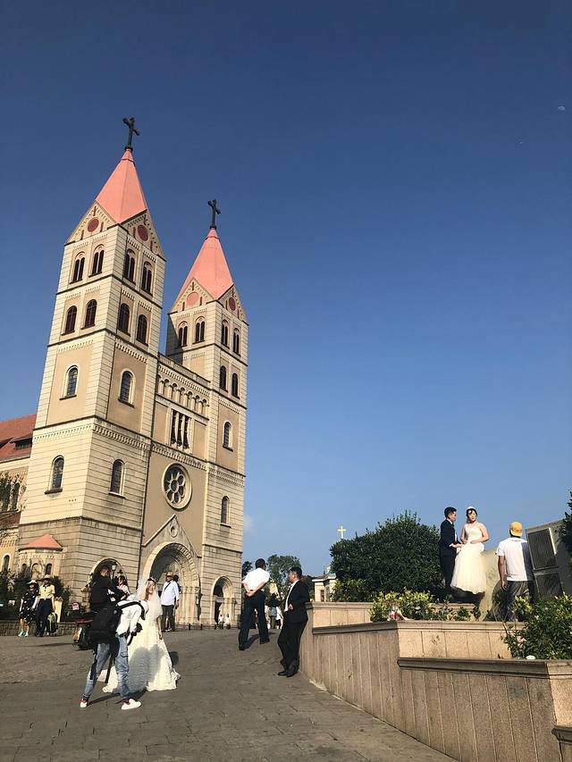 青岛天主教堂,在劈柴院的对面,本名圣弥厄尔教堂。始建于1932年,于1934年竣工。哥德式和罗马式建筑风格,塔身高56米,是建国前山东省最高的建筑,是中国唯一的祝圣教堂,位于市南区中山路德式建筑群。哥德式和罗马式的建筑风格,建国前是青岛最高建筑,中国唯一祝圣教堂。