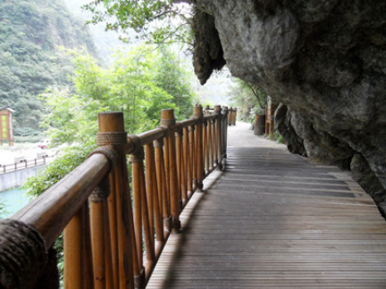 吃完方竹笋烧牛肉,进入景区,先从山脚的碧潭幽谷开始游览。如果说半山的栈道是依山而建,那碧潭幽谷景区就是依水而存,沿着芬兰木的步游道往峡谷里深入,一路上水声潺潺、绿树成荫,空气更是清新润肺,在这样曲径通幽的深谷里,别有一番幽静,令人不自觉的放松下来。