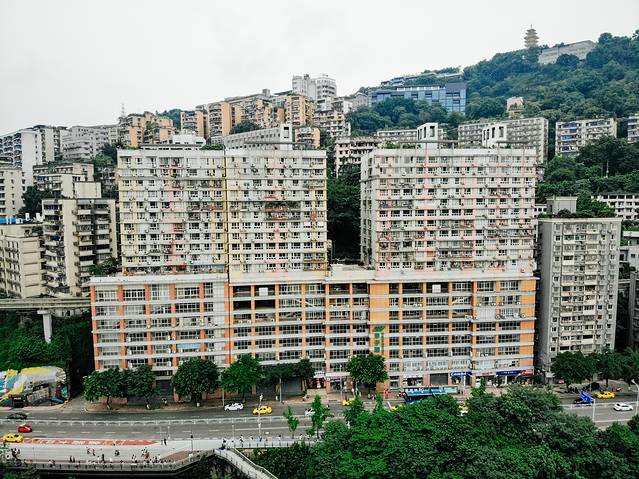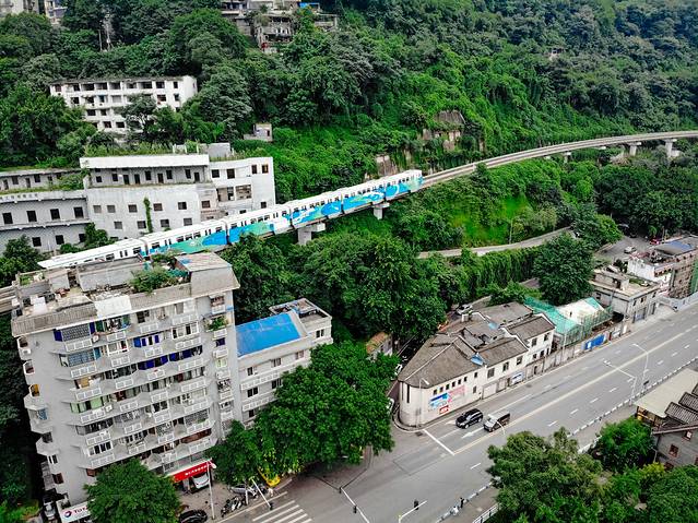 空中列车穿楼而过说的正是 重庆 轨道交通2号线李子坝车站,这里相信不用花生介绍了,网上的牛人各种口吃列车,各种凹造型的照片层出不穷,我们也凑了个热闹,不仅在经典机位打了个卡,还用无人机拍了几张