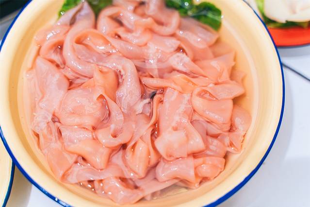 鸭肠,粉红透亮,非常新鲜,烫一下再拿出来,咬起来嘎吱嘎吱的脆