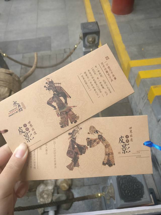 同行妹子的执念,看一场皮影戏,直接就去了在永兴坊里看到皮影戏小戏院,一位小哥在门口买着票,有茶点的VIP座好像是50元一张,我们选了普通票30一张,给的门票很别致,是一枚书签,里面还送了一枚很精美的纪念品皮影。