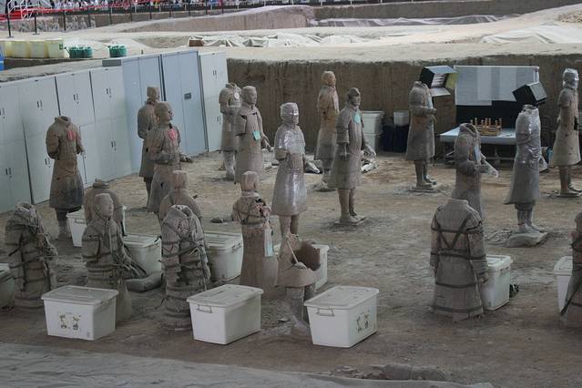 发掘工作仍在持续中,期间不乏毁坏的陶俑,文物修复就直接在现场,现实版文物医院。