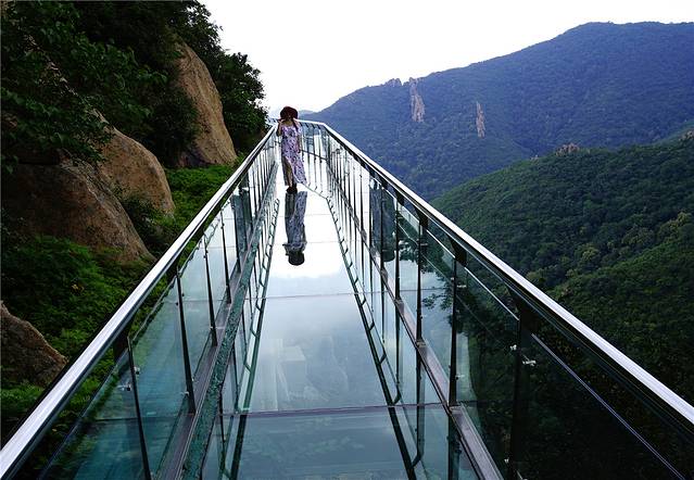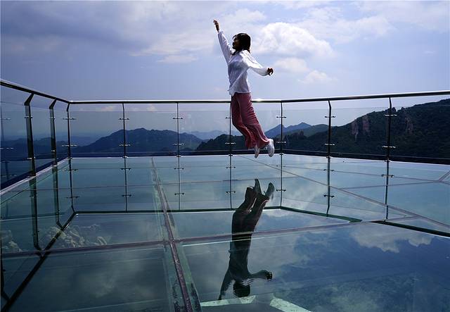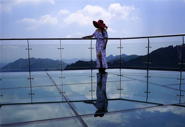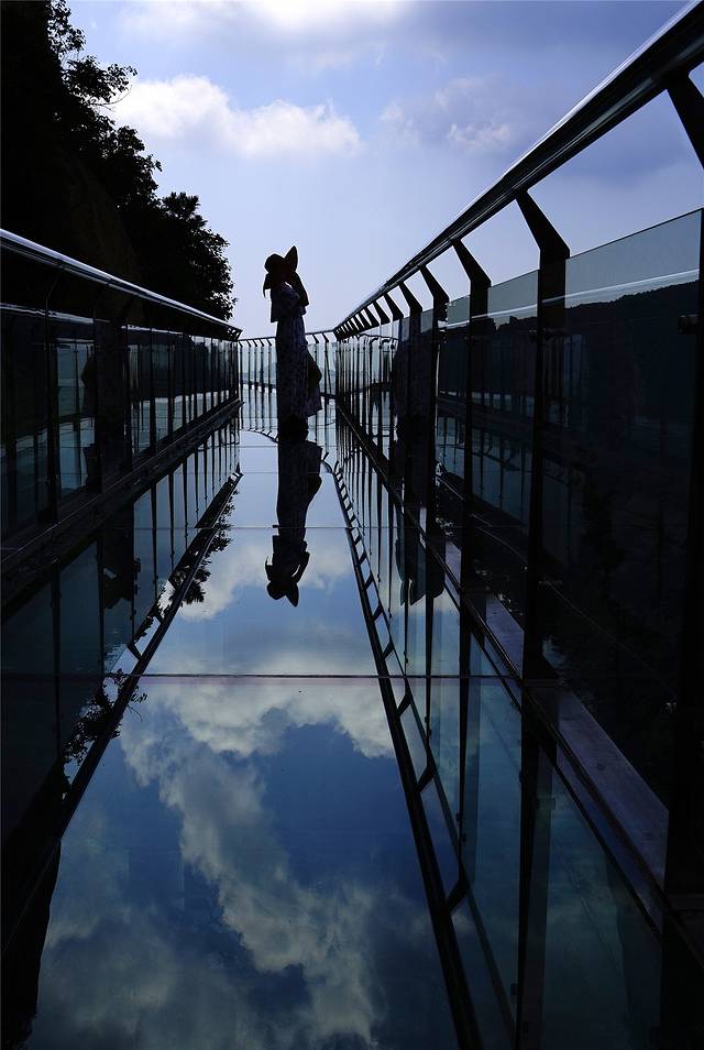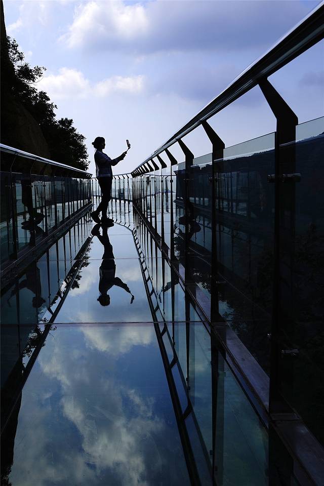 第一眼看到玻璃栈道,不禁眼前一亮,玻璃栈道上铺满了蓝天、白云,人在栈道上行走,清晰的剪影倒映在玻璃上,真真的一面悬挂在高山上的天空之镜。
